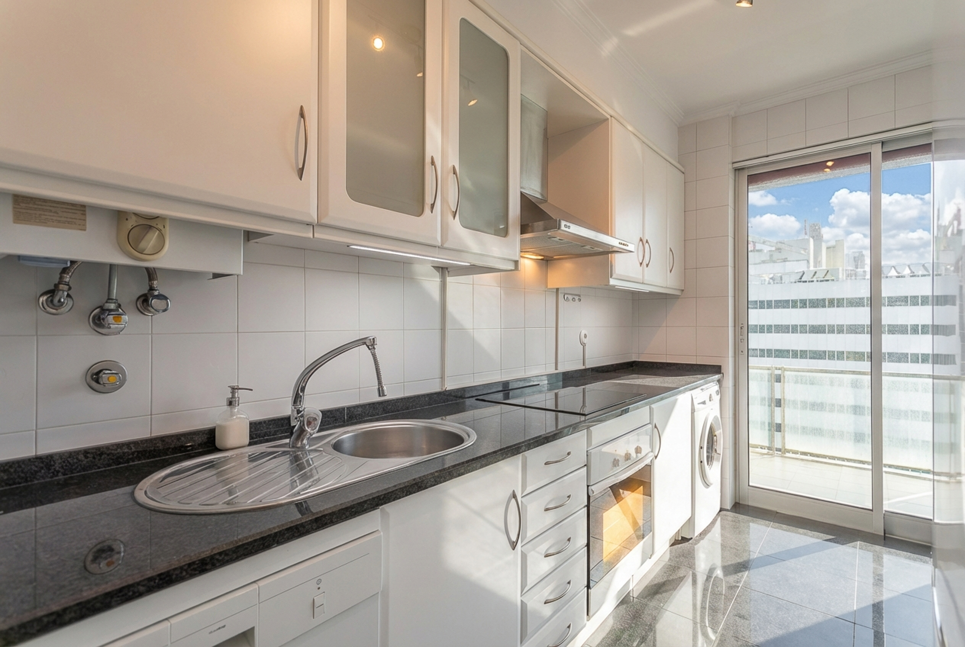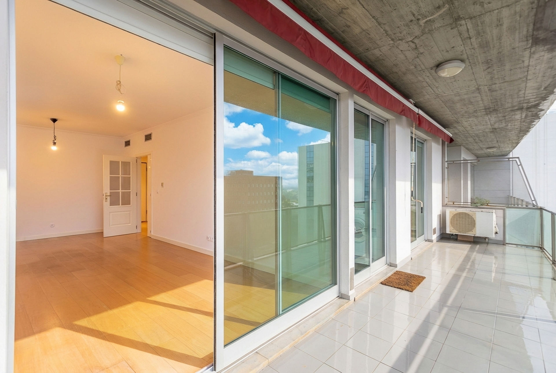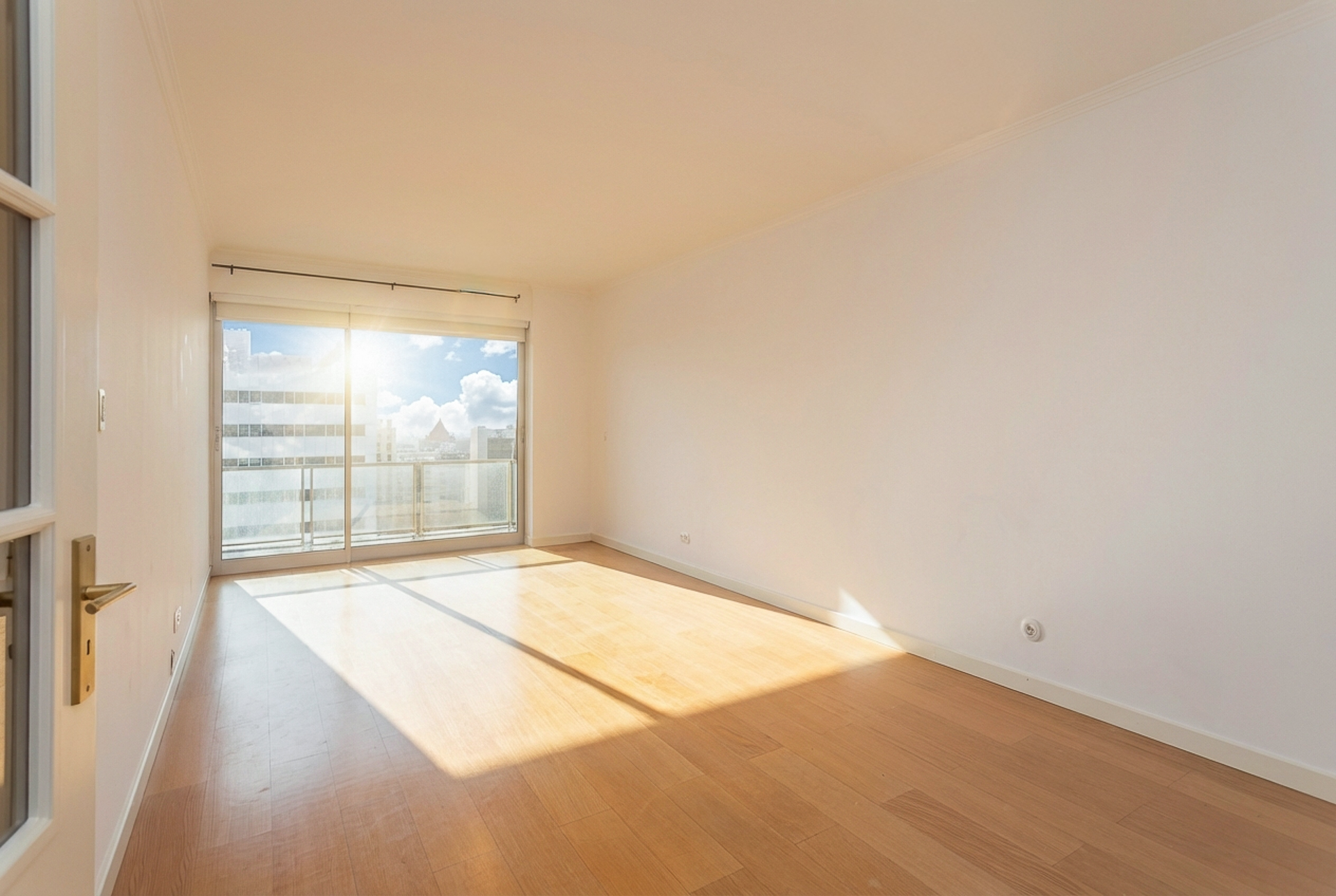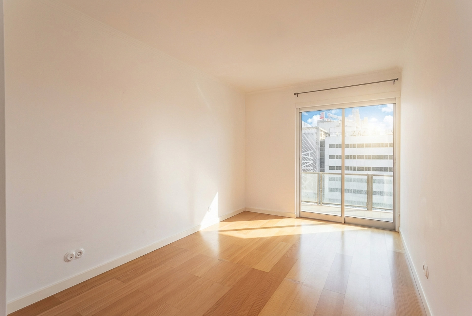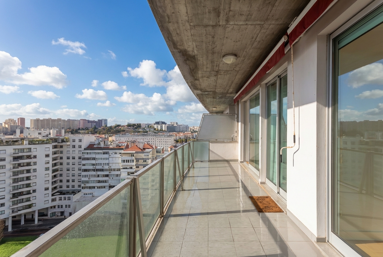 Este T1, situado num andar alto e orientado a poente, beneficia de luminosidade constante ao longo da tarde e vista desafogada sobre a cidade. A varanda generosa acompanha todo o apartamento — da sala ao quarto e à cozinha —, criando uma ligação fluida entre interior e exterior e ampliando naturalmente a sensação de espaço.